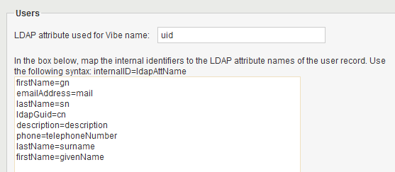 As needed, other LDAP attributes can be used, as long as the attribute is unique for each User object. For example, the mail LDAP attribute on User objects could be used to enable Vibe users to log in to the Vibe site by using their e-mail addresses.