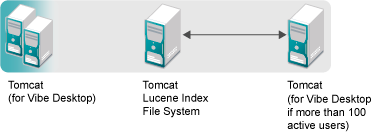 This deployment is suitable for a workgroup, department, or small company. All components are on a single server but are running typical memory allocations. If Vibe Desktop is being used with more than 100 active users, it must be running on one or more separate Vibe (Tomcat) servers.