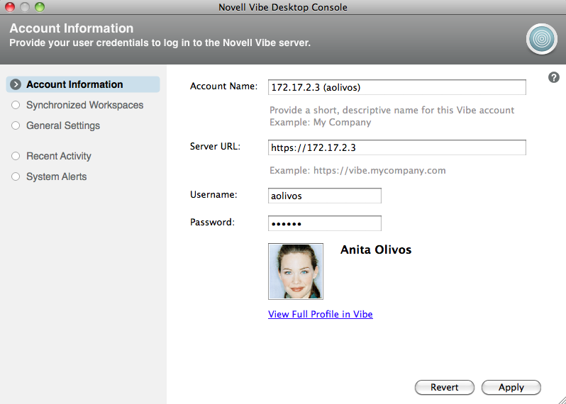 When you first configure Vibe Desktop, you specify your account information and Vibe server information. You can change your Vibe Desktop account information and Vibe server information at any time after the initial configuration: