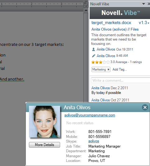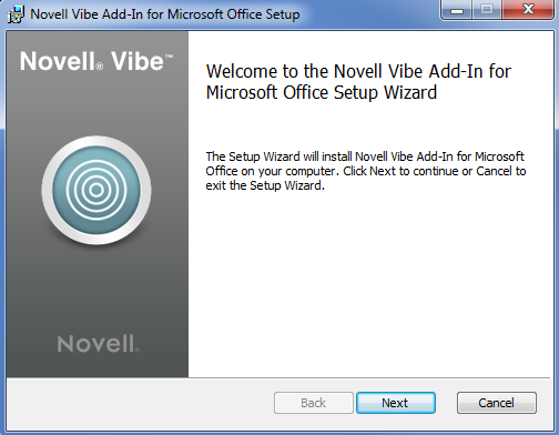 The Novell Vibe Add-in for Microsoft Office enables you to work with documents on the Vibe site without leaving Microsoft Office. You can easily browse to a document that is located on the Vibe site, open the document, edit it, then save it back to the Vibe site, directly from Microsoft Office.
