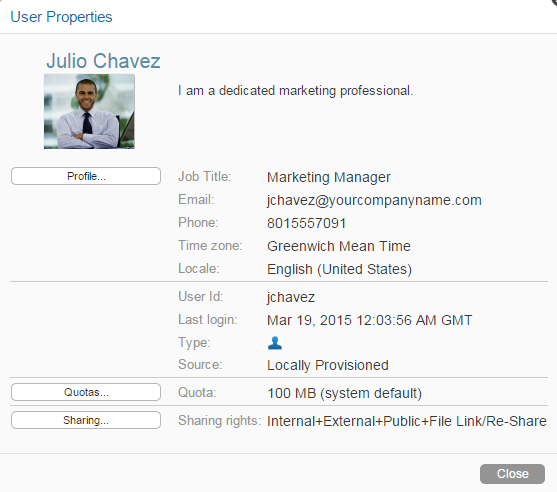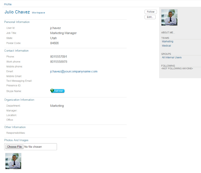 After you have designed the user profile form, as described inDesigning the User Profile Form, you can modify the user profile view. The user profile view is what a user sees when the user views a user profile in Vibe. For example: