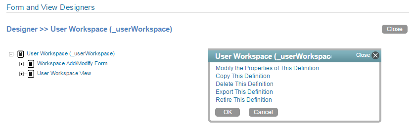 Add the form and view elements that you want your existing and future personal workspaces to contain by default.
