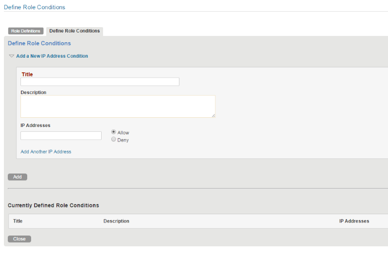 Deny: Select this option to deny access from the specified IP address. Select this option only if you have multiple IP Address fields, and one of these fields has Allow selected.