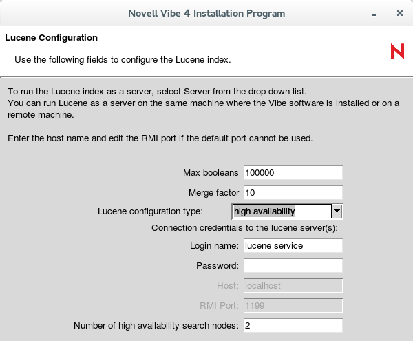Run the Vibe installation program to configure the Vibe server for multiple Lucene nodes:
