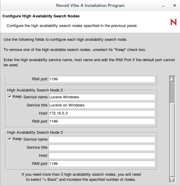 On the Configure High Availability Search Nodes page, specify the configuration information for each additional Lucene node, then click Next.