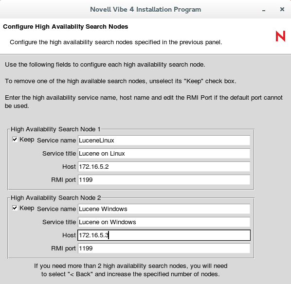 On the Configure High Availability Search Nodes page, specify the configuration information for each Lucene node from the Advanced Vibe Installation Summary Sheet that you filled out in Planning a High Availability Lucene Configuration, then click Next.