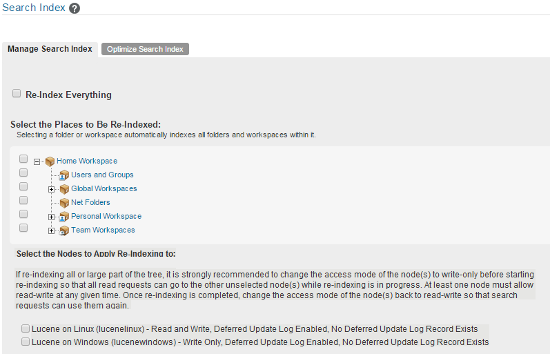 Depending on the size of your Vibe site, reindexing can be a time-consuming process. However, because one or more previously existing Lucene Index Servers are still servicing the Vibe site, users are not affected by the reindexing process.