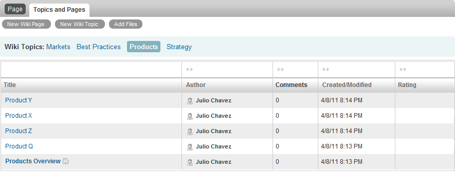 Pages are where information is contained within Wiki Topics. You can add a page to any Wiki Topic, as described in Creating a New Wiki Page.