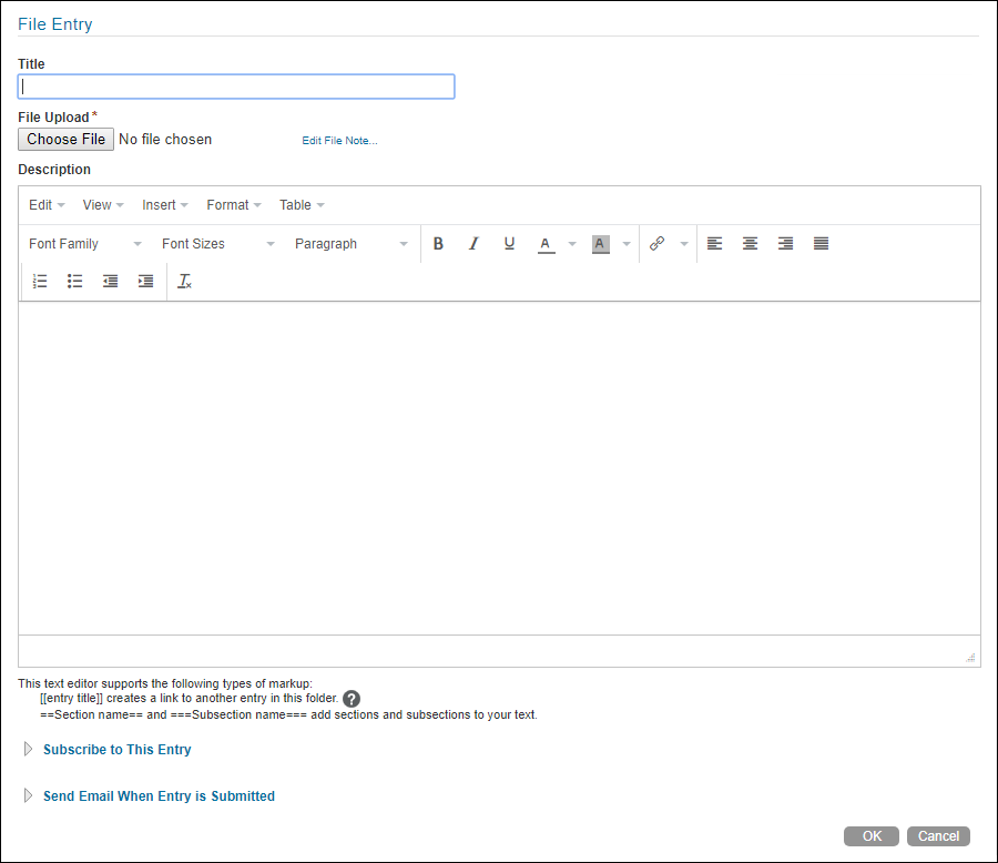 For example, the form for a File entry is what users see when they are creating a File entry. Users access this form by clicking New File Entry in a Files folder. It looks like this: