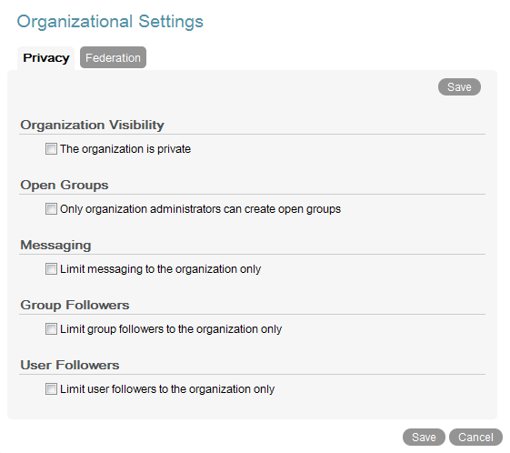 You can configure your organization to restrict users from exchanging messages between users who do not belong to the same organization. However, users can reply to messages from users outside the organization if the messages were sent before messaging privileges were restricted. Furthermore, if users who are external to the organization were included on messages sent before messaging privileges were restricted, the user or group names are displayed as “Vibe User,” “Vibe User’s feed,” and “Vibe Group’s feed”.