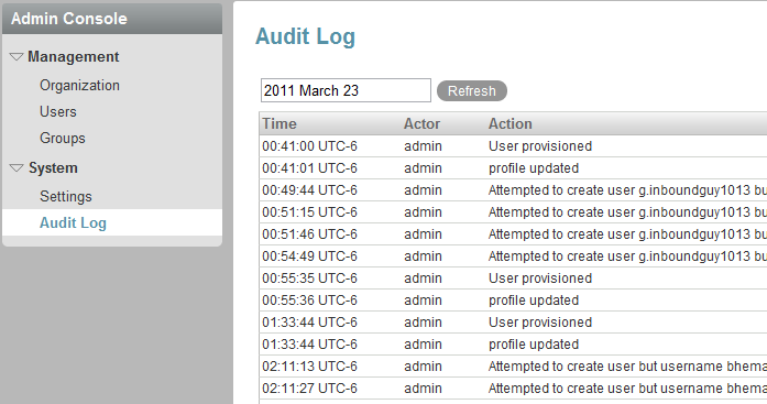 You can view activity that has occurred in the Web Admin Console for your organization. Any user who has administrative privileges can make changes in the Web Admin Console. These changes can be tracked by reviewing the audit log files.