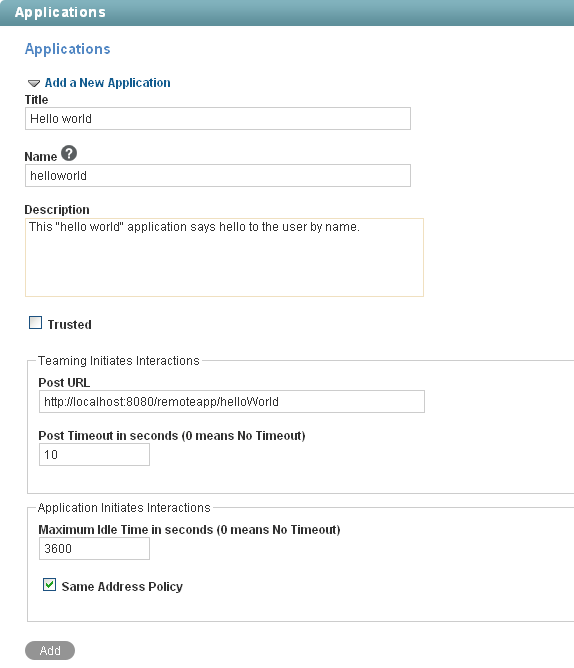 Post Timeout: Specify the number of seconds that Vibe should wait for a response from the remote application before it assumes that the remote application is not available. The default is 60 (1 minute). If Vibe does not receive a response from the remote application, it displays the page requested by the user without any input from the remote application.