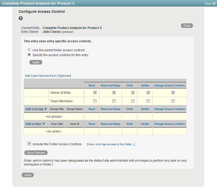 Deselect Include the Folder Access Controls if you want the new entry-level access controls to override the folder-level access controls. If you deselect this option, you must use the entry-level access controls to specify each user or group that you want to have access to the entry. Users who have access to the folder that contains the entry but have not been granted access rights to the entry itself do not have access to the entry.