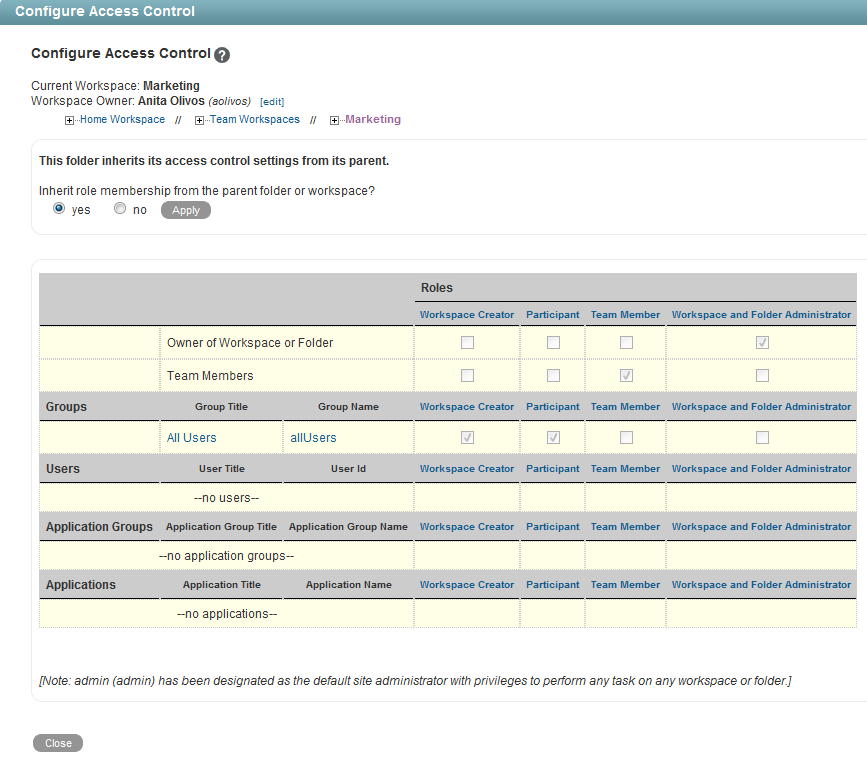 Before you can make modifications to the table on the Configure Access Control page, you need to ensure that the folder or workspace does not inherit its access control settings from its parent folder or workspace: