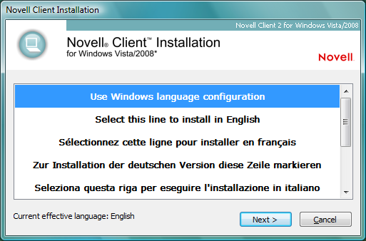 On single-language versions of Windows 7 and Windows Vista, selecting the option is no different than selecting a specific Novell Client for Windows language. For example, if you are running the German version of the Windows Vista Business Edition, selecting either or results in German being used as the language for both the Novell Client for Windows installation and the installed version of the Client.
