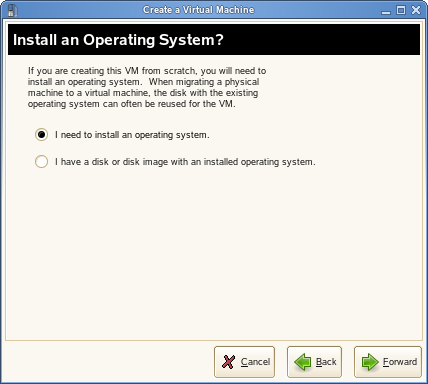The Create Virtual Machine Wizard helps you through the steps required to create a virtual machine and install its operating system. The information that follows is generalized for installing any operating system. In addition to these instructions, you should consult the Virtualization: Guest Operating System Guide for information specific to the operating system you are installing.