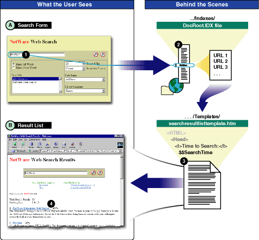 In this diagram, the user enters a search string such as "NetWare" ( 1). The search string is then searched for in the index file (2). If the search string is located, the Uniform Resource Locators (URLs) are passed on to the search results template (3) and displayed to the user (4).