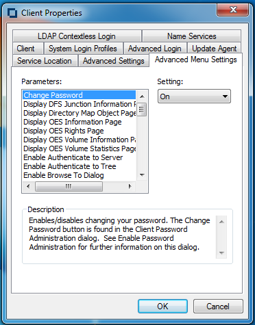 Settings: Opens the LDAP Contextless Login Parameters dialog box. Select the parameter you want, then use the Settings option to configure the parameter. For most parameters, this consists of simply turning it On or Off. Some parameters give you other configuration options. A short description of each parameter is available in the Description field when you select the parameter.
