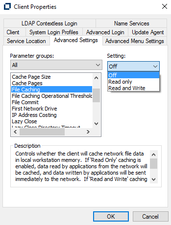 File Caching: Controls whether the Client caches files locally or not. Setting this value to Read only caches the data read by the applications from the network and the data written by the applications is sent to the network immediately. Setting this value to Read and Write returns the control to the application during data write and the data is written to the network in the background.