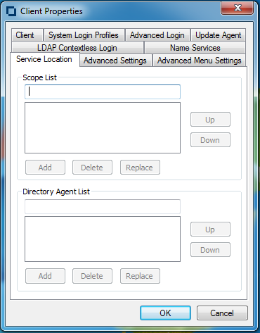 Use the Service Location property page in the Client Properties dialog box to manage a list of scope names to be reported to SLP applications for a workstation and a list of SLP Directory Agent addresses.