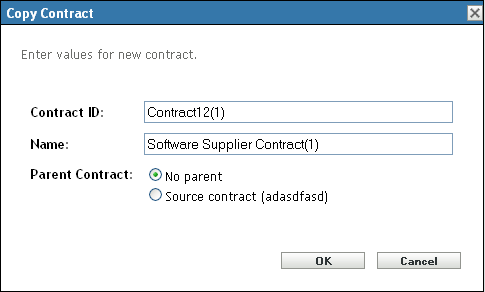 Parent Contract: If you want to designate the source contract as this contract’s parent, select Source contract. If you want to designate the source contract’s parent as this contract’s parent, select Same parent as source. Otherwise, select No parent.