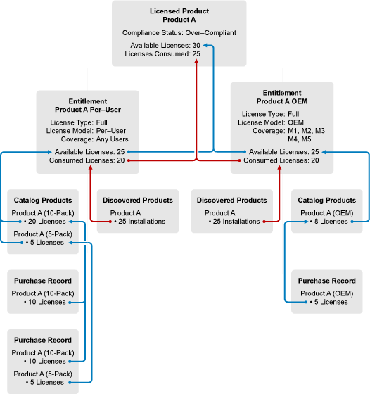 In the example, Product A (the discovered product) is associated with both entitlements. Five of the installations (on M1, M2, M3, M4, and M5) consume licenses in the Product A OEM entitlement. The other 20 installations consume licenses in the Product A Per-User entitlement.