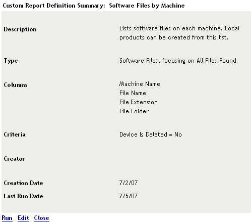 Clicking Create from Software Files opens a report definition that you can run to list all the software files on each machine in the Management Zone according to the way the inventory scan was configured.