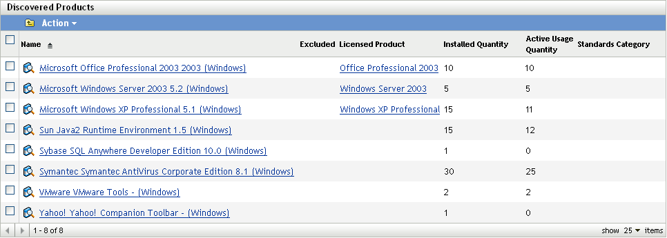 You scan the devices in your Management Zone to collect the list of installed software products. These are called discovered products. In the above illustration, the inventory scan discovered that ProductA is installed on 15 devices.