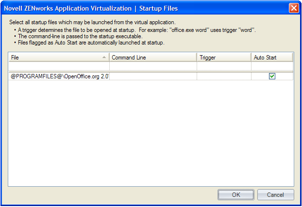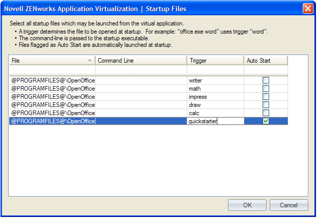 You can also create a single executable file to expose multiple executable startup files (Writer, Calc, Draw, Impress, or Math). ZENworks Application Virtualization allows multiple entry points into the virtual application to be triggered based on a command line argument to the virtual application executable. If you use Novell ZENworks or Novell ZENworks Configuration Management to distribute applications, command line arguments let you use the same application object for all OpenOffice.org programs.