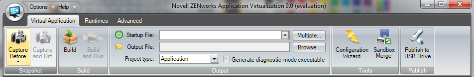 (Conditional) If you use ZENworks Configuration Management in your environment and you want to control how virtual applications are used or to create and publish ZENworks bundles, click the button on the left side of the ZENworks Application Virtualization console to display the ZENworks options.