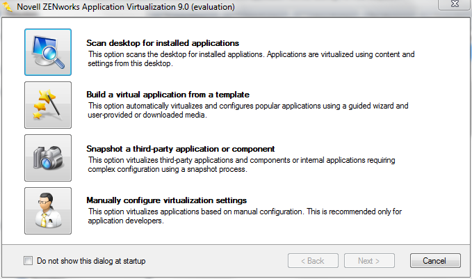 The Novell ZENworks Application Virtualization 9.0.1 startup dialog box is displayed. You can use this dialog box to scan, build, manually configure, or take a snapshot of the virtual applications installed on the device. If you do not want to see this dialog when you start the virtual application, select .