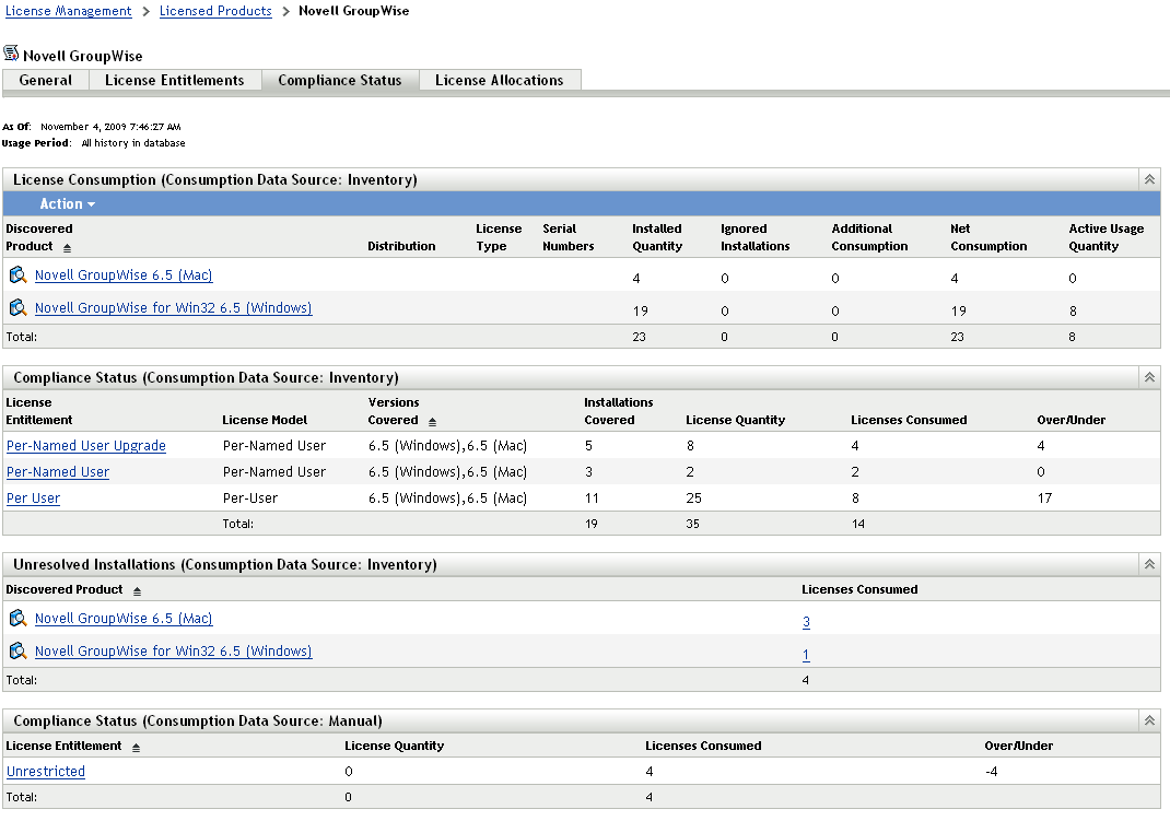Ignored Installations: Displays the number of installations that are excluded from the compliance calculations. This is a manual adjustment that you can make if there are installations you don’t want included in the net consumption. For instructions, see Section 8.8, Adjusting a Discovered Product’s Installation Count.