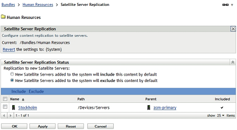 To define the Satellite devices to which the content located in the folder should be replicated, click the hyperlink of any bundle folder and click the tab. If bundles are subsequently created in the folder, the content synchronization rules of the bundle folder are automatically applied.