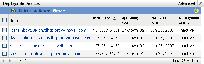 Devices that meet the requirements for the ZENworks Adaptive Agent are displayed in ZENworks Control Center in the Deployable Devices panel on the Deployment page.