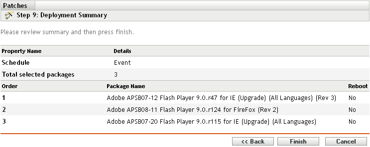 Click the button to complete the process of scheduling the deployment of a selected patch. Click the button to return to the previous page. Click to exit the wizard.