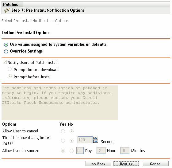 The Pre Install Notification Options page of the Deploy Remediation Wizard allows you to define whether users receive any notification when patches are downloaded and installed, and to customize the notification. Setting the notification and allowing users to cancel options is the seventh step in scheduling a deployment for a selected patch.