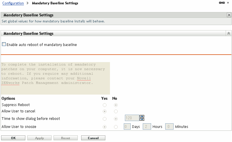The Mandatory Baseline Settings page allows you to completely control deployment of mandatory baseline patches. For example, you can decide whether or not to automatically reboot the machine when a baseline patch is applied. The page also enables you to set global options for installation of mandatory baseline patches.