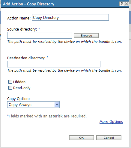 Click to display the Browse for Folder dialog box. Browse to and select the directory to copy. The path must be resolvable by the device on which the bundle is run.