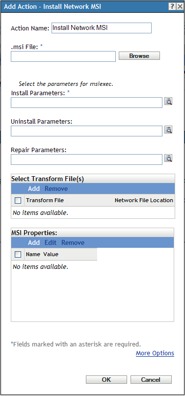 The Action - Install Network MSI dialog box lets you specify the location of the MSI file; its Install, Uninstall, and Repair parameters; the transform file; and the executable security level.