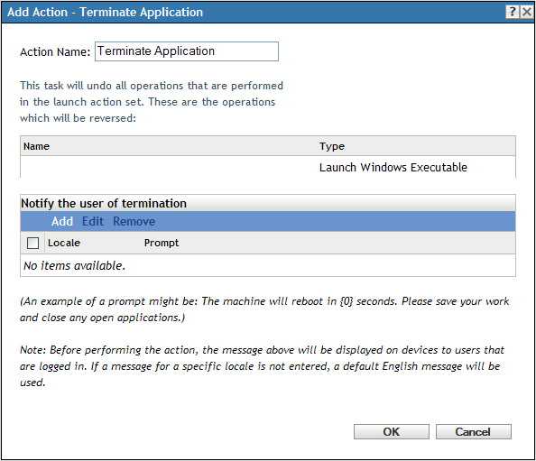 The Action - Terminate Application dialog box is displayed when you add a Terminate Application action. This dialog box lets you undo all operations that are performed in the launch action set. You can also configure a prompt to notify users of the termination. However, you are allowed to add the Terminate Application action only if it is not already added.