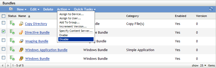 A disabled bundle is not deployed to new managed devices or replicated to content servers. It remains on the device and content server to which it has already been deployed until the next device refresh.