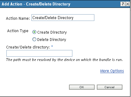 Directory Name: Specify the complete path of the directory you want to create or delete on the managed device.This path must be resolved by the device on which the bundle is run.