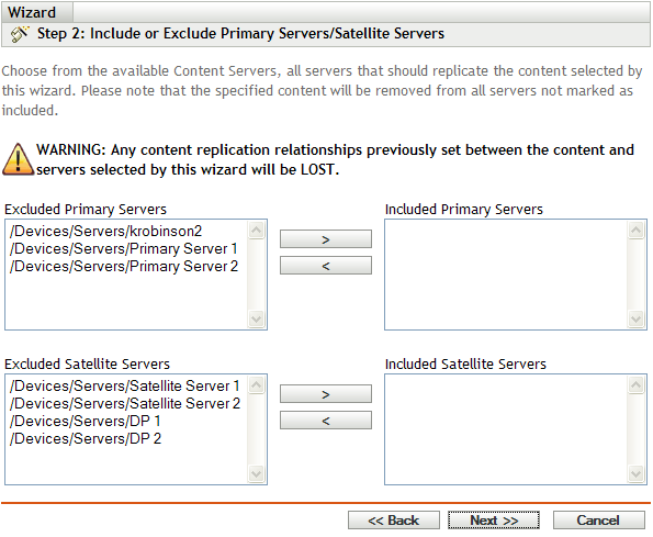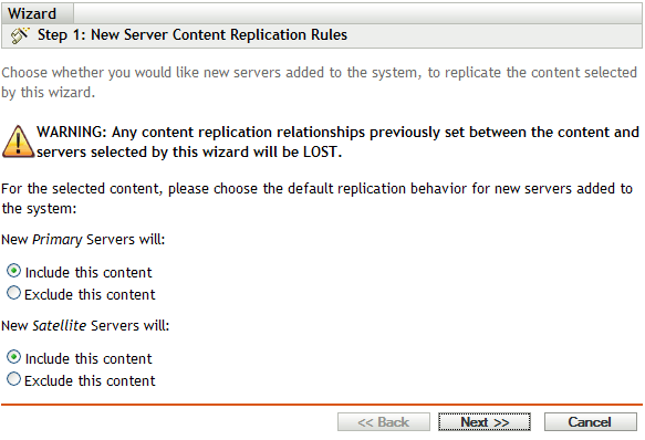 Be aware that any content replication relationships previously set between the content and servers are lost upon completion of this wizard.