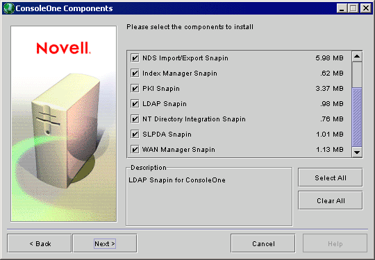 In the ConsoleOne Components window, leave all the default components selected > click Next.