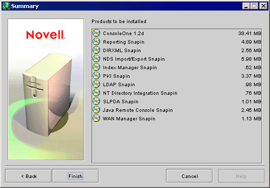 In the Summary window, click Finish to initiate the ConsoleOne install Progress window.