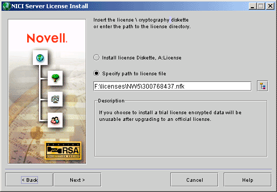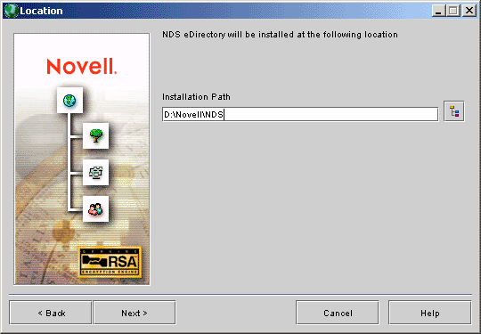 In the Location window, change the Installation Path field to D:\Novell\NDS > click Next.