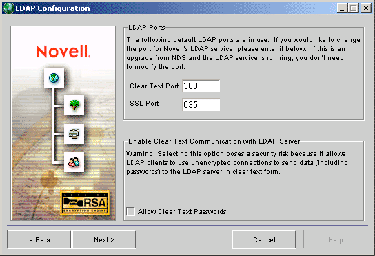In the LDAP Configuration window, change the Clear Text Port to 388 > change the SSL Port to 635 > click Next.