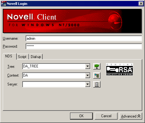In the Novell Login dialog box, click the Advanced button > enter the following values > click OK: