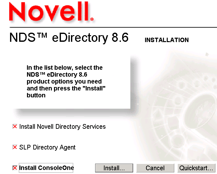 On the Novell eDirectory 8.6 Installation page, select all three options: Install Novell Directory Services, SLP Directory Agent, Install ConsoleOne options > click Install.