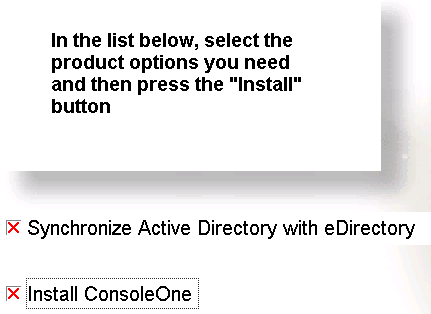 In the Novell Account Management for Windows 2000 splash window, enable both the Synchronize Active Directory with eDirectory and the Install ConsoleOne options > click the Install button.
